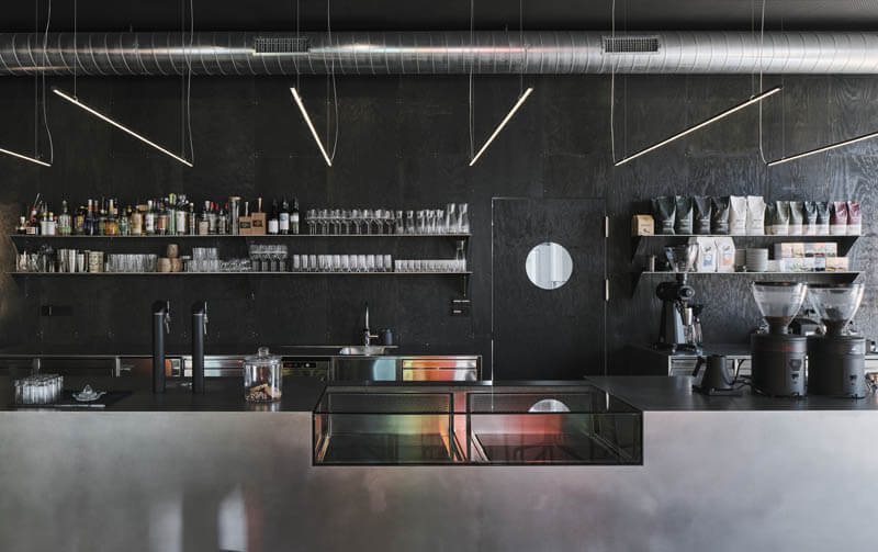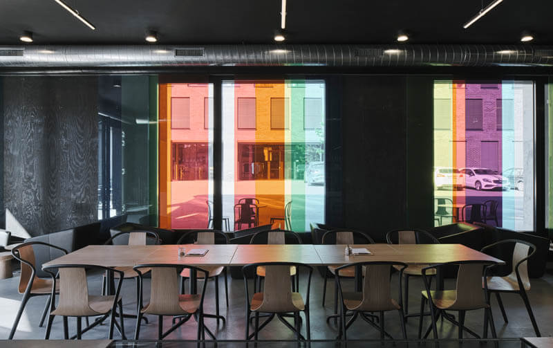 Wer in solch inspirierendem Umfeld arbeitet, möchte auch seine Pausen und Geschäftsessen in entsprechender Atmosphäre verbringen. Dafür wurde das Café Postgarage geschaffen, welches urbanen Lifestyle mit traditioneller Kaffeehauskultur verbindet. Designt wurde die Einrichtung vom Architekten Oskar Leo Kaufmann: Grau in verschiedenen Schattierungen dominiert die Räumlichkeiten vom Boden über Theke und Wände bis zur Decke. Unterbrochen wird diese starke, elegante Farbgebung nur durch Elemente aus Holz und Glas. So ist in die Theke eine – ebenfalls rauchgraue – Glasvitrine eingelassen, in der sich die gegenüberliegenden polychromen Schiebetüren spiegeln. Die Gestalter haben sich hierbei bewusst für unser rahmenloses Schiebesystem GM LIGHTROLL® 10/12 entschieden. Ausgeführt in GM VSG LAMIMART® sind die integrierten verschiedenfarbigen Folien nicht nur ein optisches Highlight, sie öffnen auch den Blick hin zum Außenbereich des Cafés. Die zwölf Schiebetüren laufen auf drei Ebenen und dienen den Gästen als vielfach erprobter Wind- und Wetterschutz. Rostfreie Kugellagerrollen in Alu-Laufschienen und eingezogene Bürstendichtungen garantieren einen ruhigen Lauf sowie wartungsarme Langlebigkeit. Die untere Laufschiene ist entsprechend der Gestaltung im Industrial Style schwarz-ähnlich eloxiert. Darin integriert ist eine spezielle Fräsung, die für eine optimale Wasserableitung an der Profiloberfläche sorgt. Befestigt wurde die Schiebeanlage mit Alu-Winkeln.