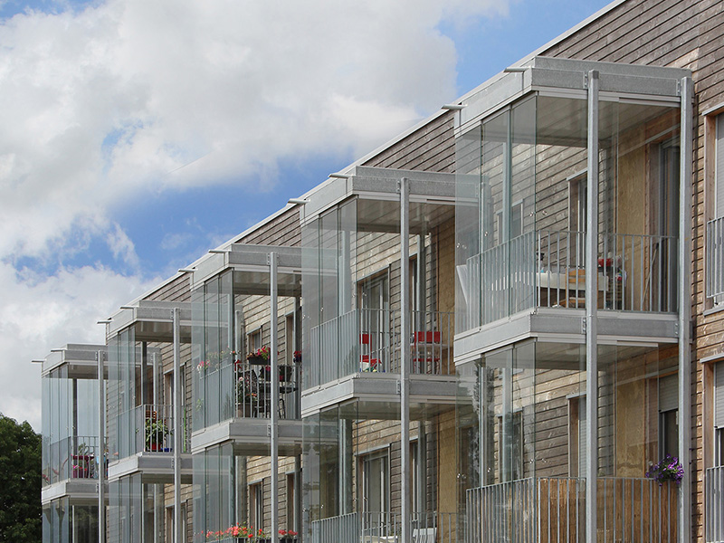 Due to its orientation towards the south, the use of heat storing walls is optimal and the transparent glazing of GM TOPROLL® 10/14 sliding doors from GLAS MARTE allows maximum use of passive solar energy. The room-high sliding glass panes of the system close the balconies on all three sides, so they also serve as an additional noise protection from the road. The balconies are located directly in front of the living rooms. In order to achieve a thermal separation, these are not structurally connected to the building construction.
