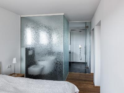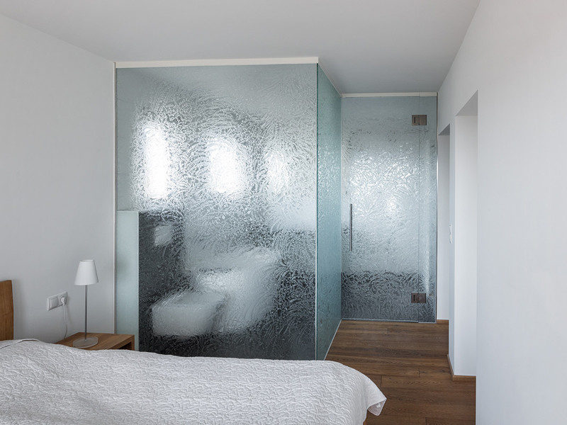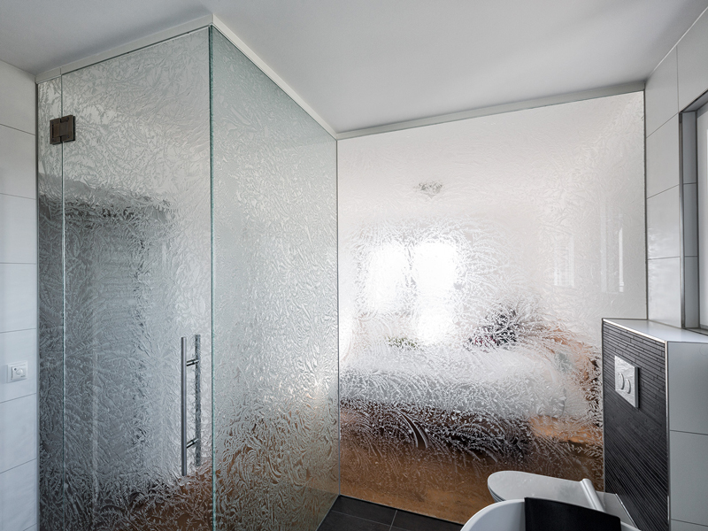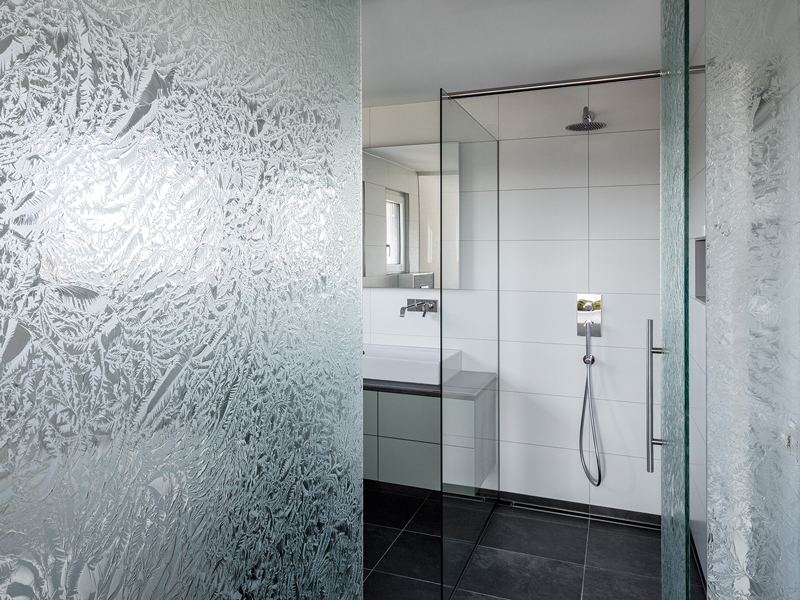 ICE–H® enables glass applications that diffuse the light without the use of paints or other third-party products and thus remain faithful to glass as the only material used. When viewing the glass, different degrees of light reflections occur, which is reinforced by the surface structure. The play of light and shadow that emerges behind the glass surface is at least as impressive as the glass itself.