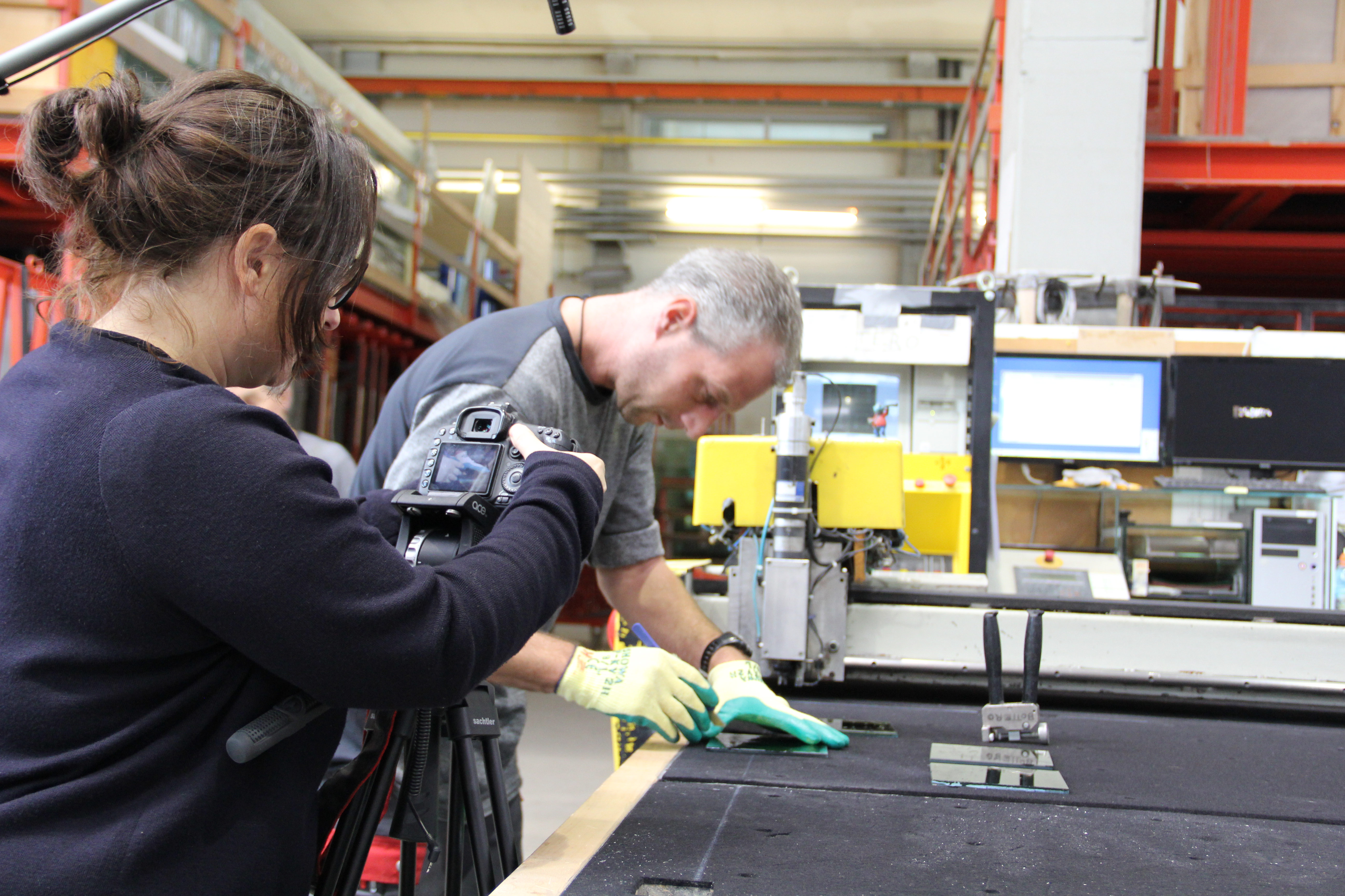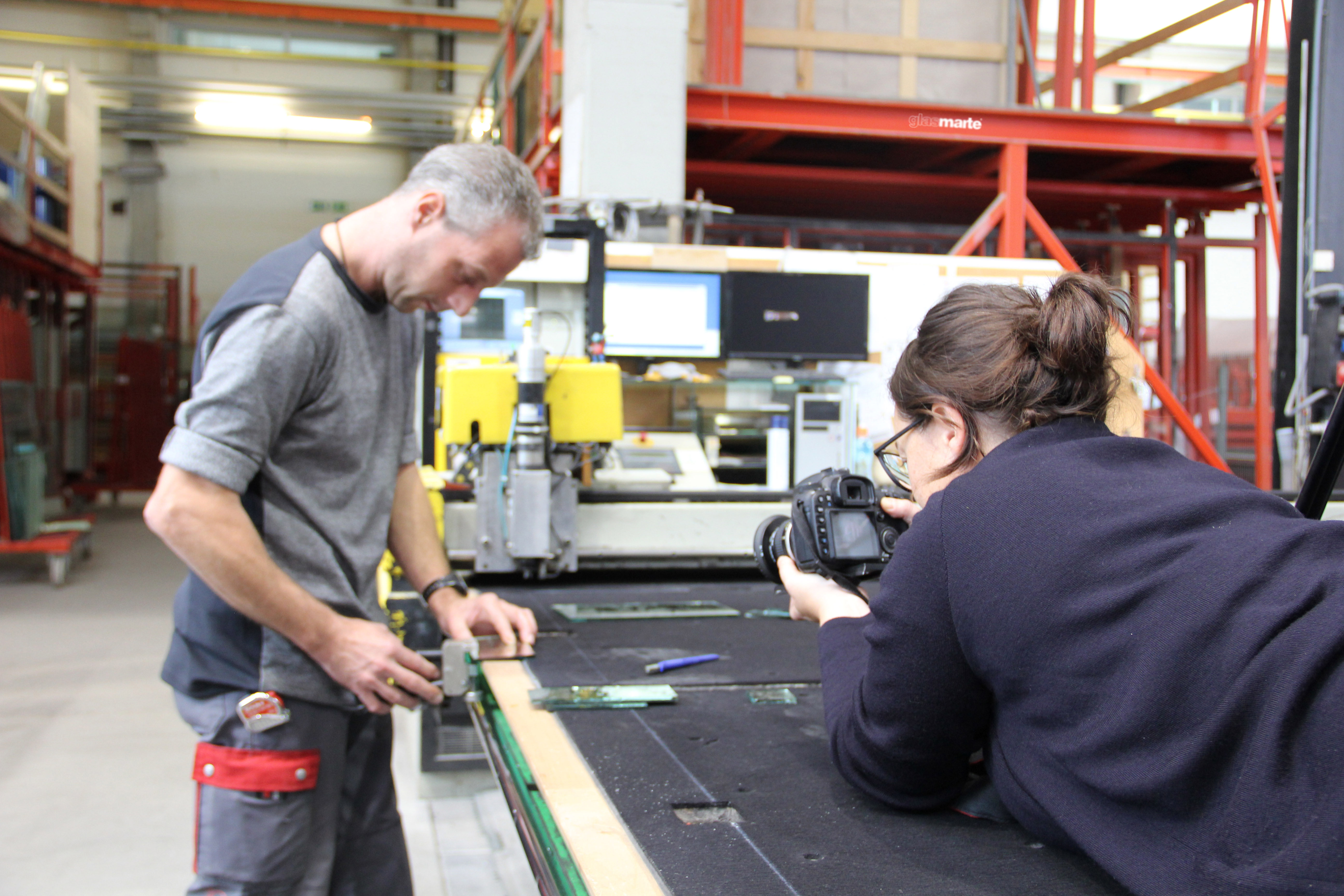 Glas Marte lud die Künstlerin zu sich ein, führte sie durch den Betrieb und bearbeitete ein von ihr ausgewähltes Sonnenschutzglas – alles aufgenommen von der Kameralinse der Künstlerin. In Großaufnahme werden der maschinengesteuerte Zuschnitt sowie die anschließende Handarbeit, mit der die Scheibe in die gewünschten Einzelteile zerlegt wird, gefilmt. Einen ähnlichen Prozess hat Ainara Elgoibar bereits in Spanien dokumentiert. „Die Firma hatte einen ganz anderen, ängstlicheren Zugang zum Werkstoff Glas. Bei Glas Marte spürt man gleich, dass es sich um einen Familienbetrieb handelt, bei dem der Geschäftsführer sein Produkt in- und auswendig kennt, von der Leistung seiner Mitarbeiter überzeugt ist und dies auch gerne nach außen transportiert.“