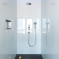 GM DUSCHEN sind der ideale Spritzschutz, da sie fugenlos, porenfrei sowie putzmittelresistent sind. Und obendrein noch dekorativ. Ob Nischendusche, Ganzglas-Dusche oder Duschabtrennung, ob aus klarem, farbigem, bedrucktem oder satiniertem Glas – wir fertigen ganz nach den Wünschen unserer Kunden. Noch leichter zu reinigen ist das speziell beschichtete korrosionsbeständige GM SHOWER GLASS, das auch nach vielen Jahren noch aussieht wie neu.