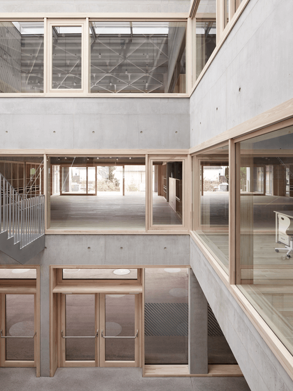 Grundlage des innovativen pädagogischen Konzepts bilden die acht autonomen Cluster – Kleinschulen. Dafür war gute Tageslichtqualität entscheidend sowie starke innen- und außenräumliche Beziehungen, eine prägnante räumliche Definition und schließlich eine wohnliche Atmosphäre: Durch großformatige, widerstandsfähige VSG-Scheiben bringen die verschiedenen Innenhöfe Tageslicht ins Gebäudeinnere. Bei der Wahl der Gläser wurde speziell Wert auf Schall- und Brandschutz gelegt. Die vielen Sichtachsen fördern den Austausch zwischen den Departments, welche allesamt an die zentrale Aula angebunden sind.