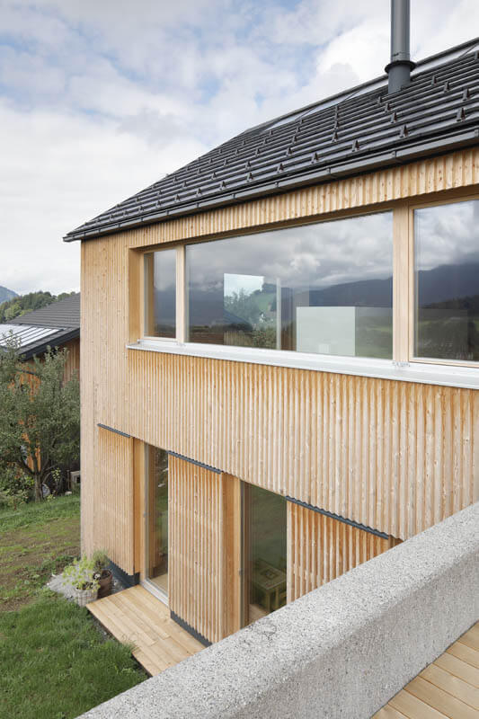 Viele Gründe sprechen für die Holzbauweise: der aktive Beitrag zum Klimaschutz durch die damit verbundene CO2-Reduktion, die platzsparende Bauweise, ein ausgeglichenes Raumklima durch den «atmenden» Baustoff Holz, eine verkürzte Bauzeit – und nicht zuletzt die thermische Dämmung durch Holz. Ein Holzhaus bietet gleichermaßen Schutz vor Kälte im Winter wie vor Wärme im Sommer. Temperaturschwankungen werden mit einer Phasenverschiebung von bis zu 14 Stunden aufgenommen. Das wirkt sich positiv auf das Raumklima und den Organismus der Bewohner aus. Mit der Wahl der passenden Fenster wird diese hervorragende Dämmung der Holzbauweise komplettiert – optimale Energiewerte sind das Ergebnis. Wer mit Holz baut und so zur regionalen Wertschöpfung beiträgt, wird sich im besten Fall auch für einen Isolierglas-Hersteller aus der Region entscheiden. Gut, dass beim Bau dieses Einfamilienhauses im Bregenzerwald Glas Marte nicht weit war: Mit unseren UNIGLAS® ISOLIERGLÄSERN werden Wärmedämmung und Energiegewinnung gefördert. Zum Wohle der Raumluft im Inneren des Gebäudes. Mit dem großflächigen Einsatz von Fenstern wird hier die ländliche Umgebung ins Haus geholt. Die so entstandene Verschmelzung der Landschaft mit dem hölzernen Innenleben des Hauses bildet einen behaglichen Kokon, dessen Anblick bereits eine wohltuende Ruhe ausstrahlt.